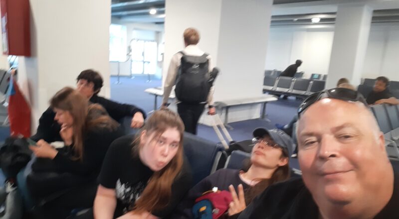 Levés à 4h30, les valises sont enregistrées. On comate devant le petit déjeuner 😀 avant d’embarquer … départ programmé à 8h45